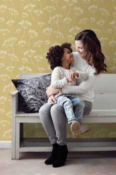 Vliesová tapeta na zeď v horčicové barvě a bílým rostlinným motivem.