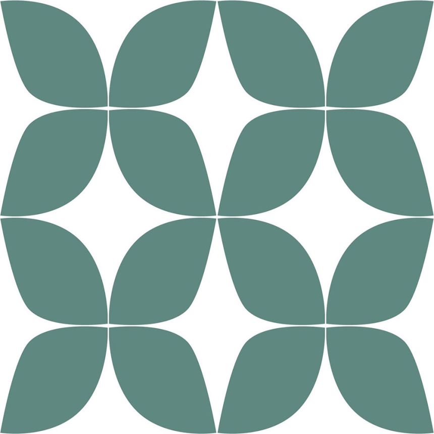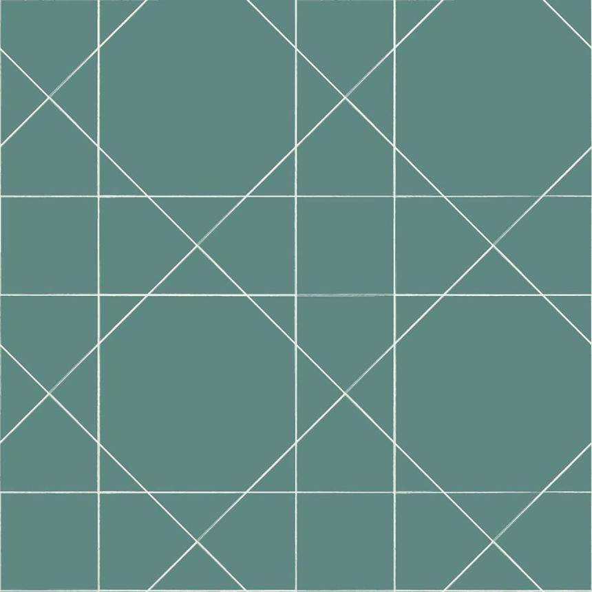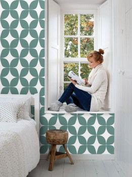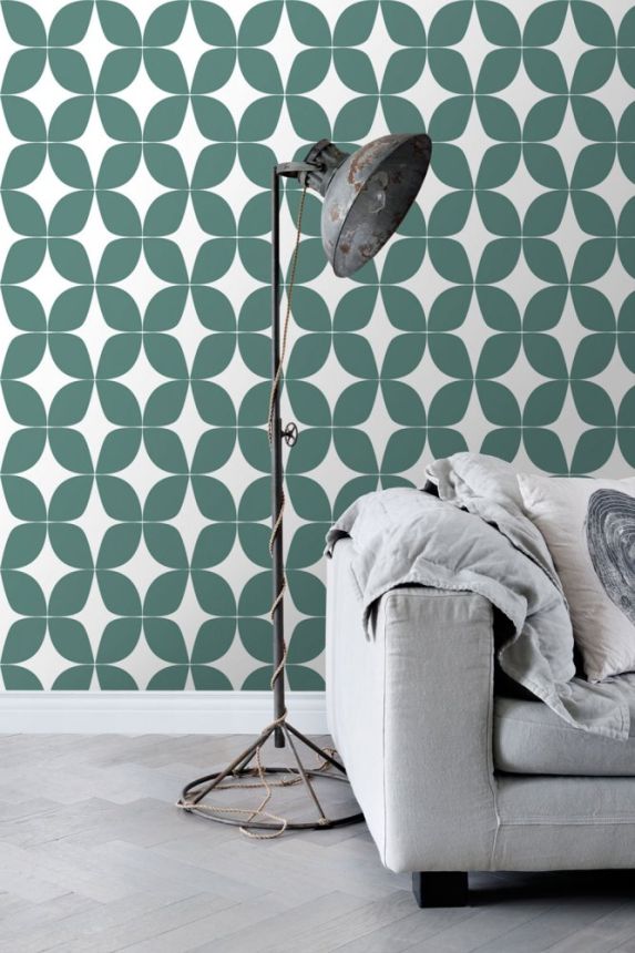 Vliesová, bílá geometrická tapeta se zeleným vzorem.