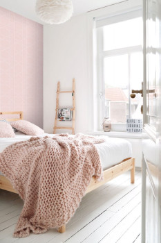 Vliesová, růžová tapeta s bílým geometrickým vzorem.