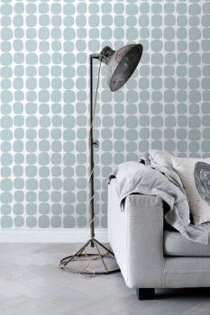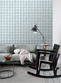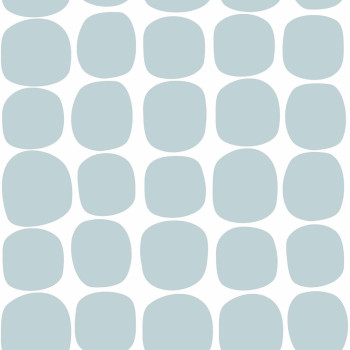 Vliesová, bílá tapeta s blankytně modrým geometrickým vzorem.