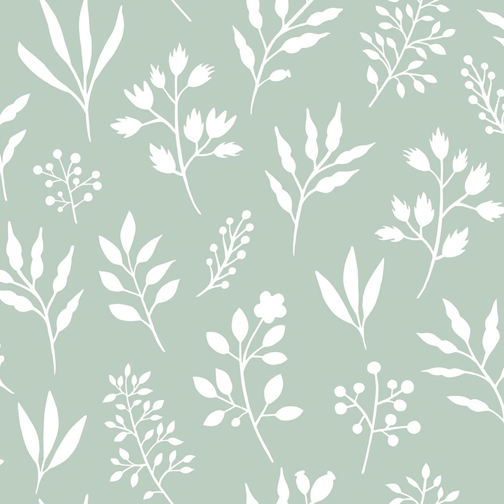 Vliesová tapeta ve scandi stylu - bílý rostlinný vzor na světle zeleném podkladu.