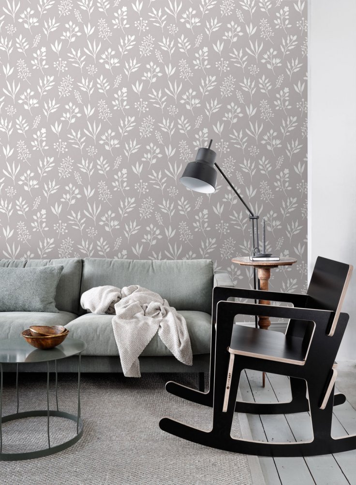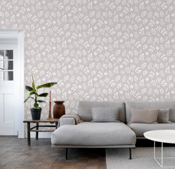Vliesová, šedá tapeta ve skandinávském stylu s bílým rostlinným vzorem.