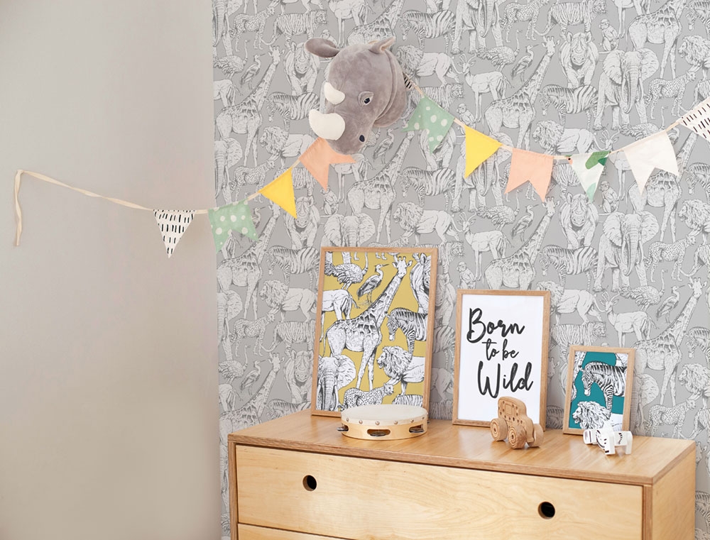 Dětská vliesová tapeta Džungle, 108567, Jungle Animals Grey, Kids@Home 6, Graham & Brown