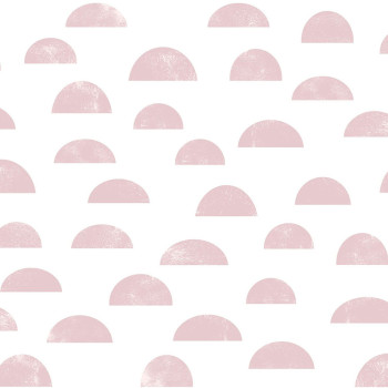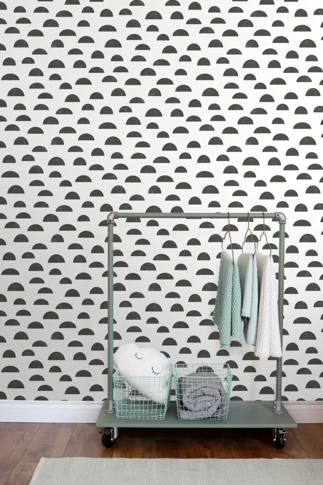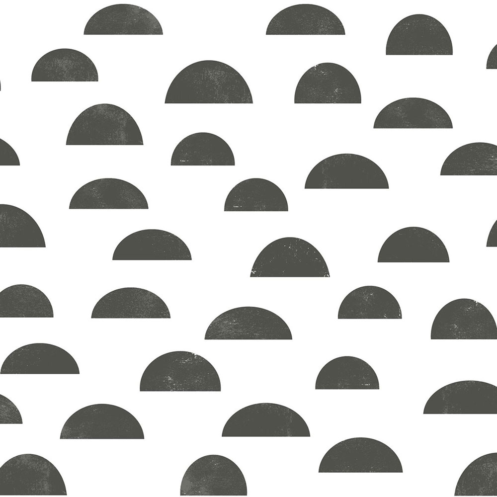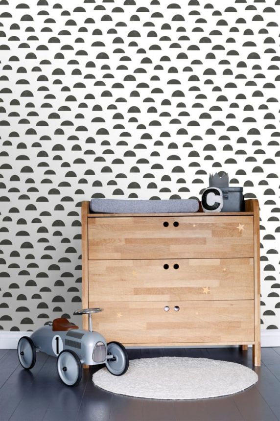 Vliesová, bílá tapeta s černými nepravidelnými půlkruhy.