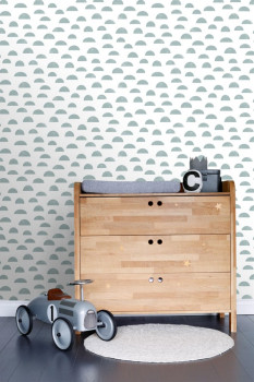 Vliesová, bílá tapeta se zelenými nepravidelnými půlkruhy.
