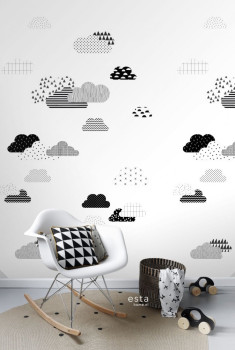 Vliesová bílá obrazová tapeta s černo-bílými mráčky.