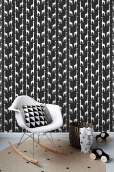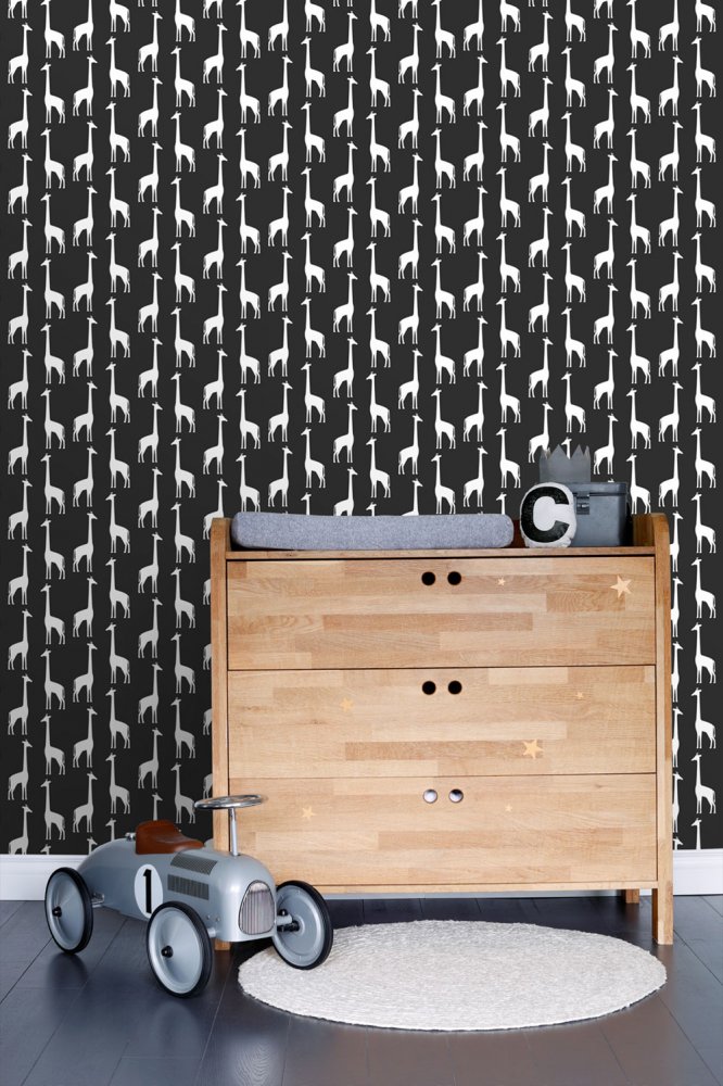 Vliesová, černá tapeta s bílými žirafami.