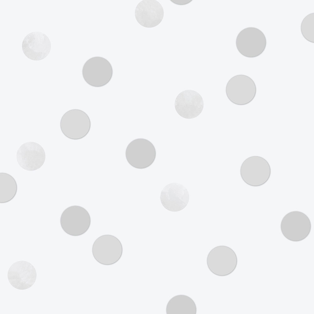 Vliesová, bílá tapeta s šedými a stříbrnými puntíky.