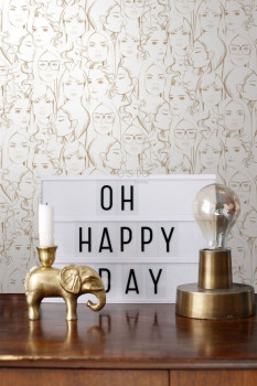 Vliesová bílá tapeta se zlatým vzorem ženských obličejů.