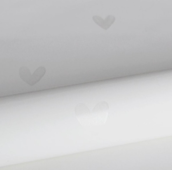 Vliesová bílá tapeta na zeď s jemně stříbrnými metalickými srdíčky.