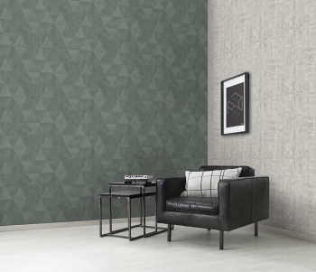 Vliesová, tmavě šedá tapeta s geometrickým vzorem s černými prolisy.