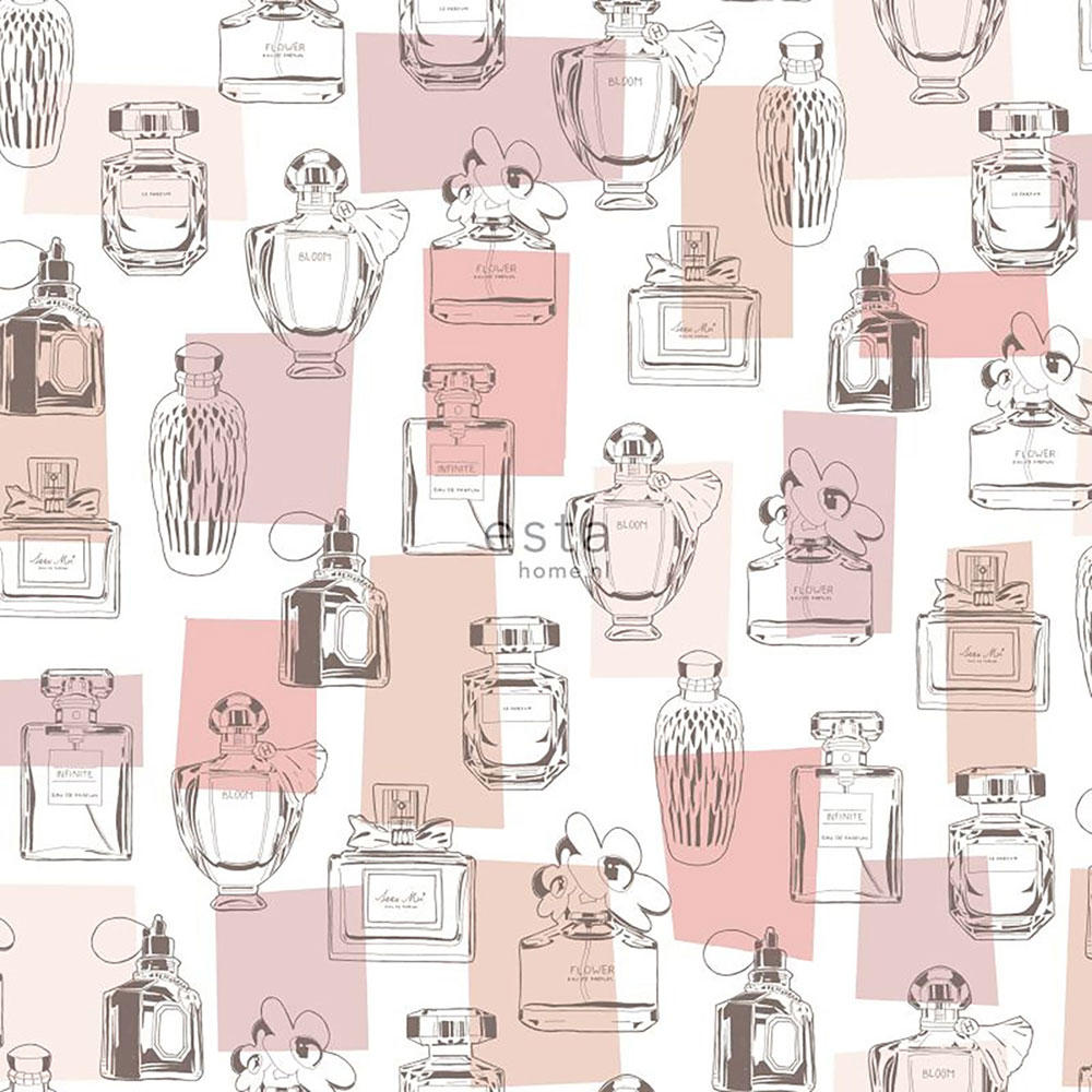 Vliesová perlově lesklá tapeta s flakonky parfémů a pastelovými detaily.