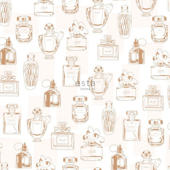 Vliesová bílá tapeta s metalicky hnědými malovanými flakonky parfémů a perlovými detaily.