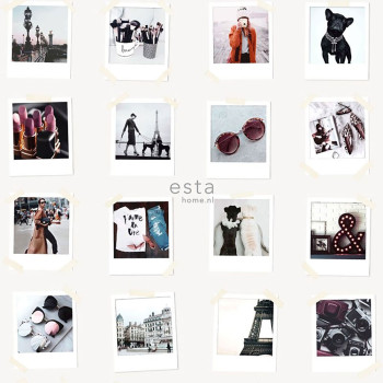 Vliesová bílá tapeta s netradičními různorodými fotografiemi.