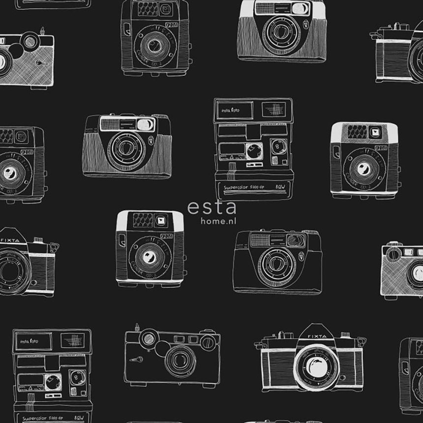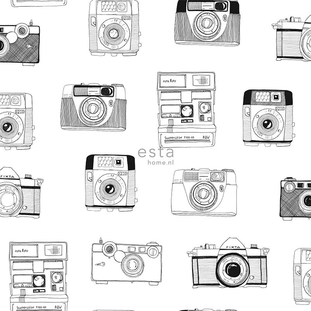 Vliesová bílá tapeta na stěnu s motivem retro fotoaparátů.