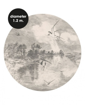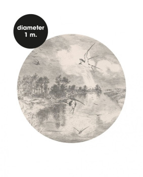Kruhová tapeta s přírodou a ptáky.