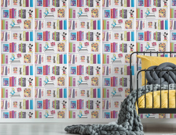 Papírová, dětská tapeta - kninovna s Disneyho obrázky a knížkami.
