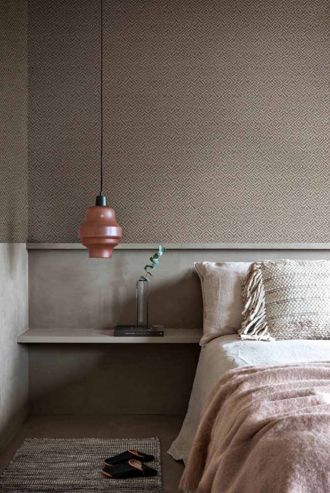 Vliesová tapeta s geometrickým vzorem v černých, hnědých a šedo-béžových odstínech.