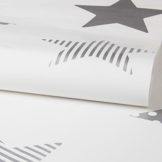 Vliesová, bílá tapeta se stříbrnými hvězdami.