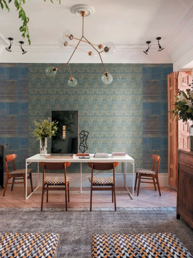 Vinylová tapeta. Jemně plastická textura v tónech modré a hnědé , design hrubší textilie.