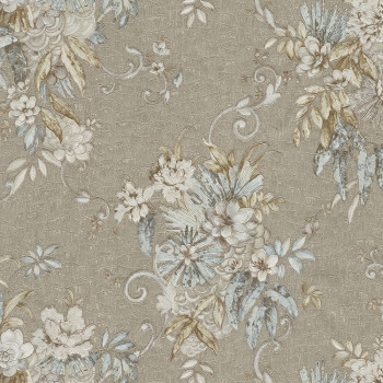 Luxusní květinová tapeta - podklad vlies, povrch plastický vinyl. Velký květinový vzor, podklad plastický vzorek. Barvy na tapetě - podklad hnědá s metalickým leskem a drobnými třpytkami, vzor odstíny šedo-modré, stříbrné a zlaté.