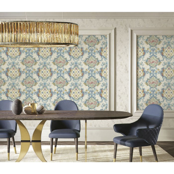 Luxusní vliesové tapety s vinylovým povrchem. Bohatý zámecký ornamentální vzor, plastická textura, odstíny na tapetě - šedo-béžové, vzor modrá, červená, zlatá, zlaté třpytky.