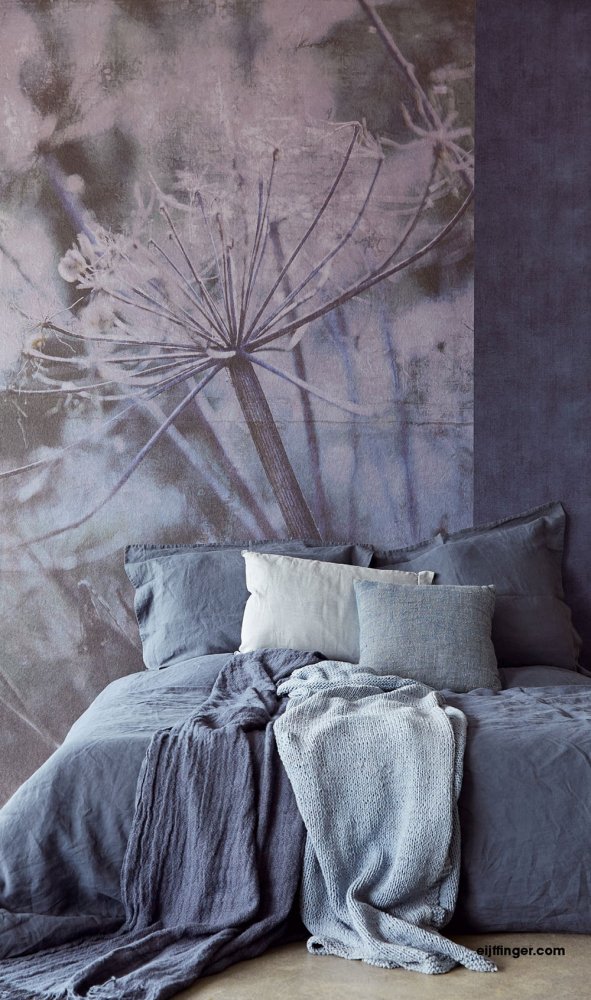 Vliesová obrazová tapeta s rostlinným motivem v modro-šedých barvách.