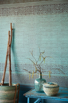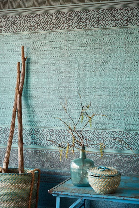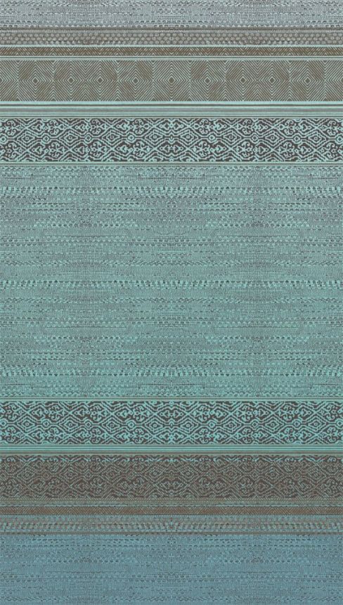 Vliesový tapetový panel Luxusní tyrkysový vzor s jemným perleťovým leskem na tmavě hnědém podkladu.