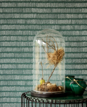 Vliesová zelená tapeta s geometrickým vzorem a stříbřitým leskem.