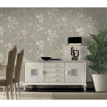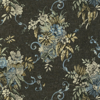 Luxusní květinová tapeta - podklad vlies, povrch plastický vinyl. Velký květinový vzor, podklad plastický vzorek. Barvy na tapetě - podklad černá s drobnými zlatými třpytkami, vzor odstíny metalické modré, zelené, béžové, šedé.