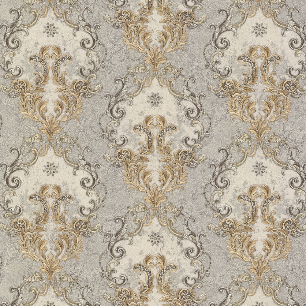Luxusní vliesové tapety s vinylovým povrchem. Bohatý zámecký ornamentální vzor, plastická textura, odstíny na tapetě - decentní béžová a šedo-béžová se zlatavými odlesky, vzor hnědo-zlatý se zlatými třpytkami.