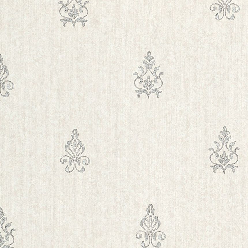 Luxusní vinylová tapeta se stříbrným ornamentálním vzorem, matný šedo-bílý podklad má vzhled a texturu jemně mramorované textilie.