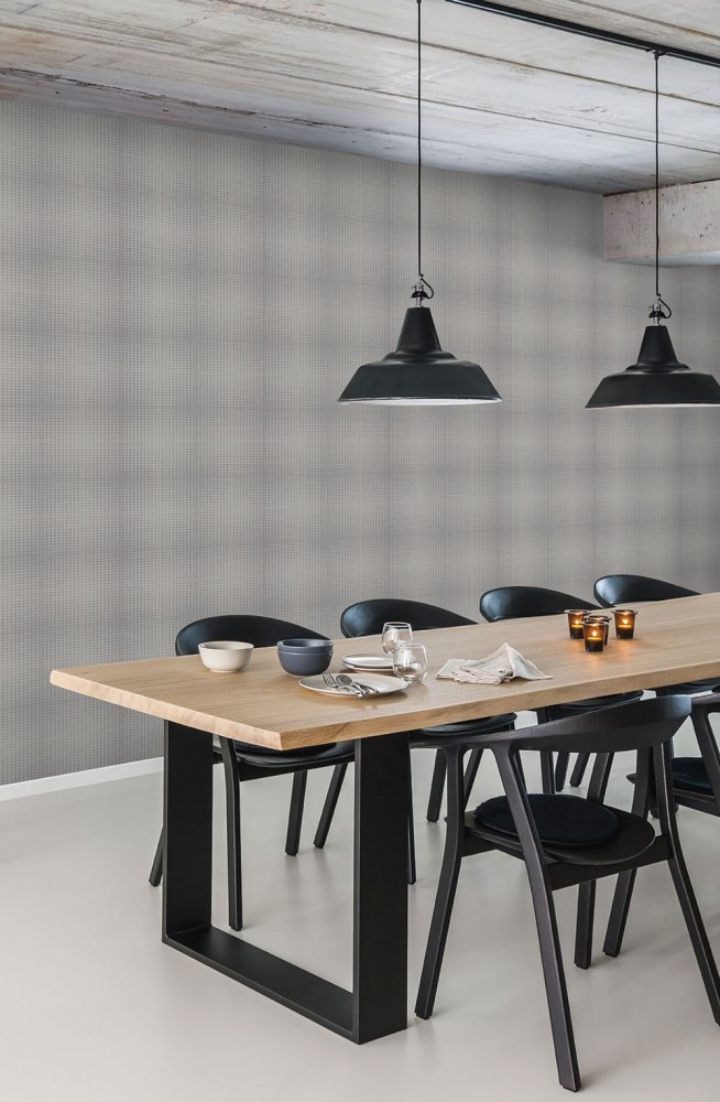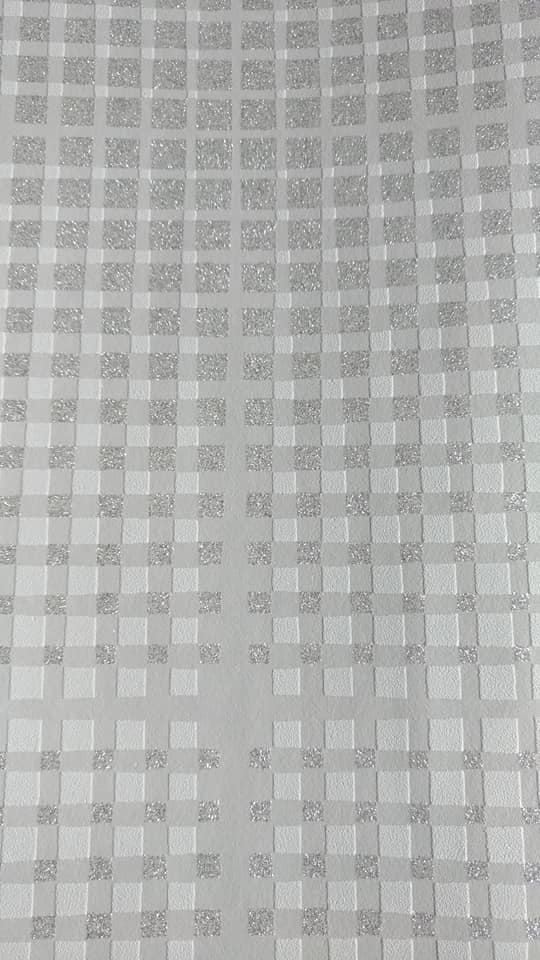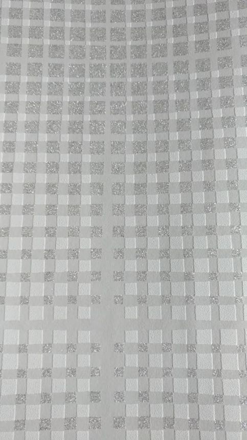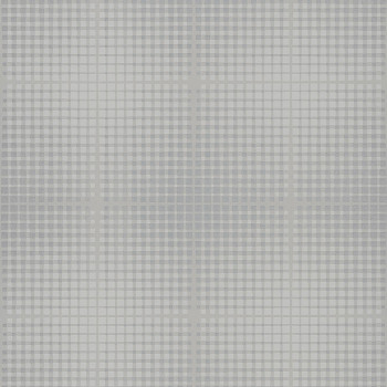 Vliesová tapeta s geometrickým vzorem a výraznou texturou v odstínech šedé se stříbrnými třpytkami.