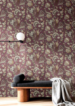 Luxusní vliesová tapeta s vinylovým povrchem, fialový podklad s látkovou texturou, romantický motiv kvetoucích větviček v odstínech šedé a béžové, ptáci v odstínech zlaté.