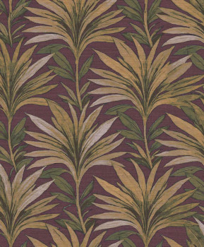 Luxusní vliesová tapeta s vinylovým povrchem, vzor evokuje textilii, listy, fialový podklad, listy v kombinaci odstínů zelené, žluté a šedé.