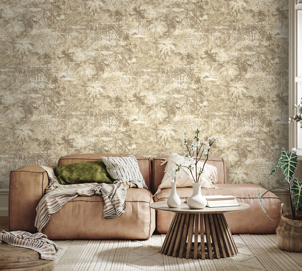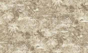 Vliesová tapeta s vinylovým povrchem, motivy palem, hnědo-béžové odstíny, látková textura.