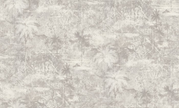 Vliesová tapeta s vinylovým povrchem, motivy palem, šedé odstíny, látková textura.