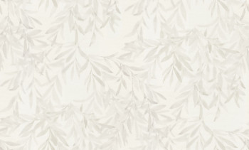 Vliesová tapeta s vinylovým povrchem, smetanově bílý podklad, vétvičky s listy v odstínech šedé, látková textura.