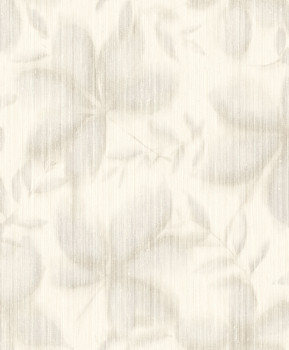Vliesová tapeta s vinylovým povrchem, plastická textilní struktura, listy, světle béžový podklad, prosvítající listy v odstínech hnědé.
