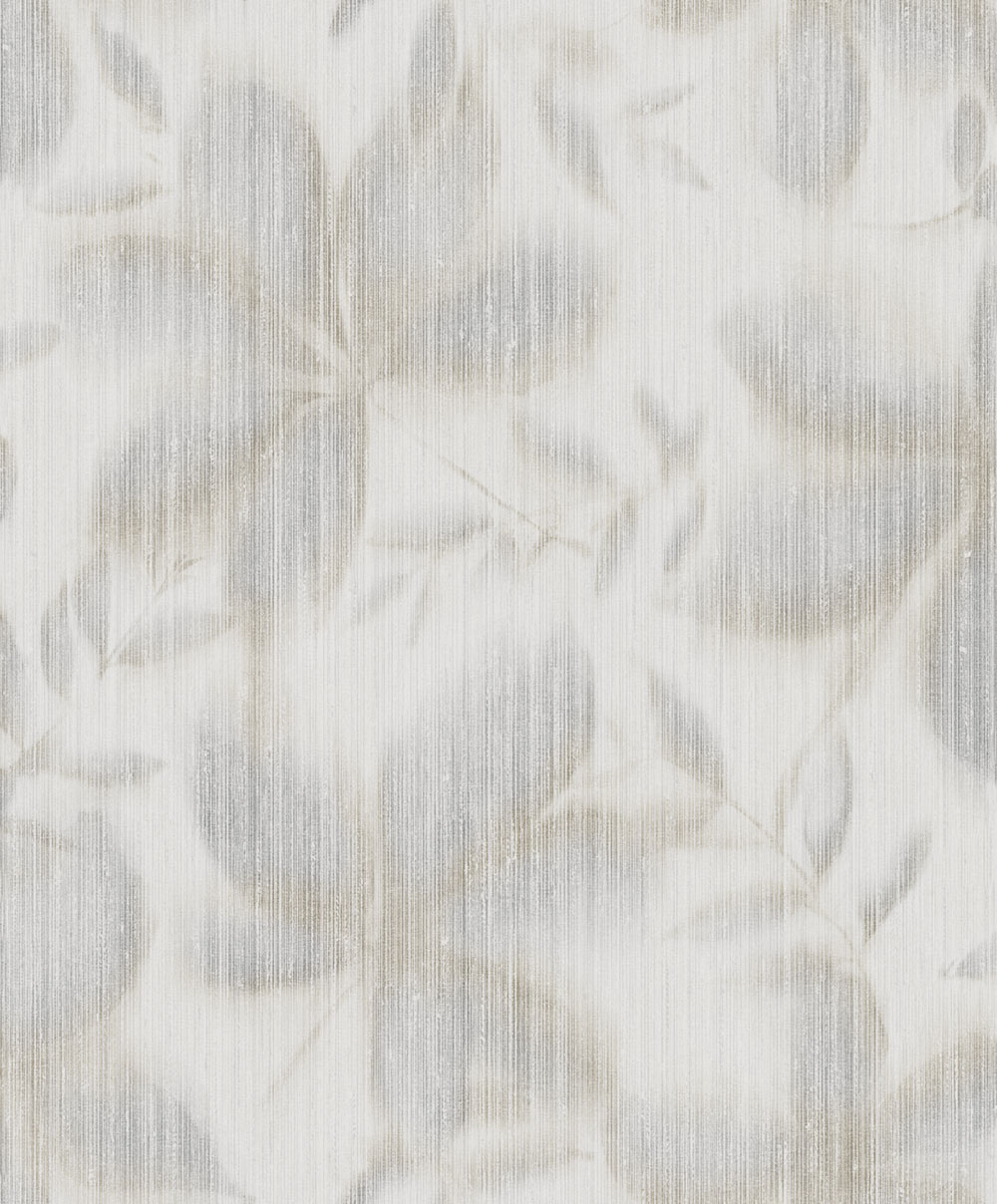 Vliesová tapeta s vinylovým povrchem, plastická textilní struktura, listy, světle šedo béžový podklad, prosvítající černo hnědé listy.