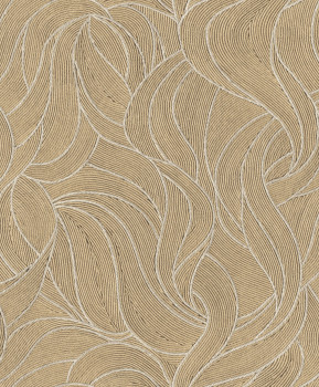 Vliesová tapeta s vinylovým povrchem, jemná textilní textura, vlnky, vzor evokuje jemné pruhy, světle hnědá s tmavě hnědými vlákny tvořícími vlnky.
