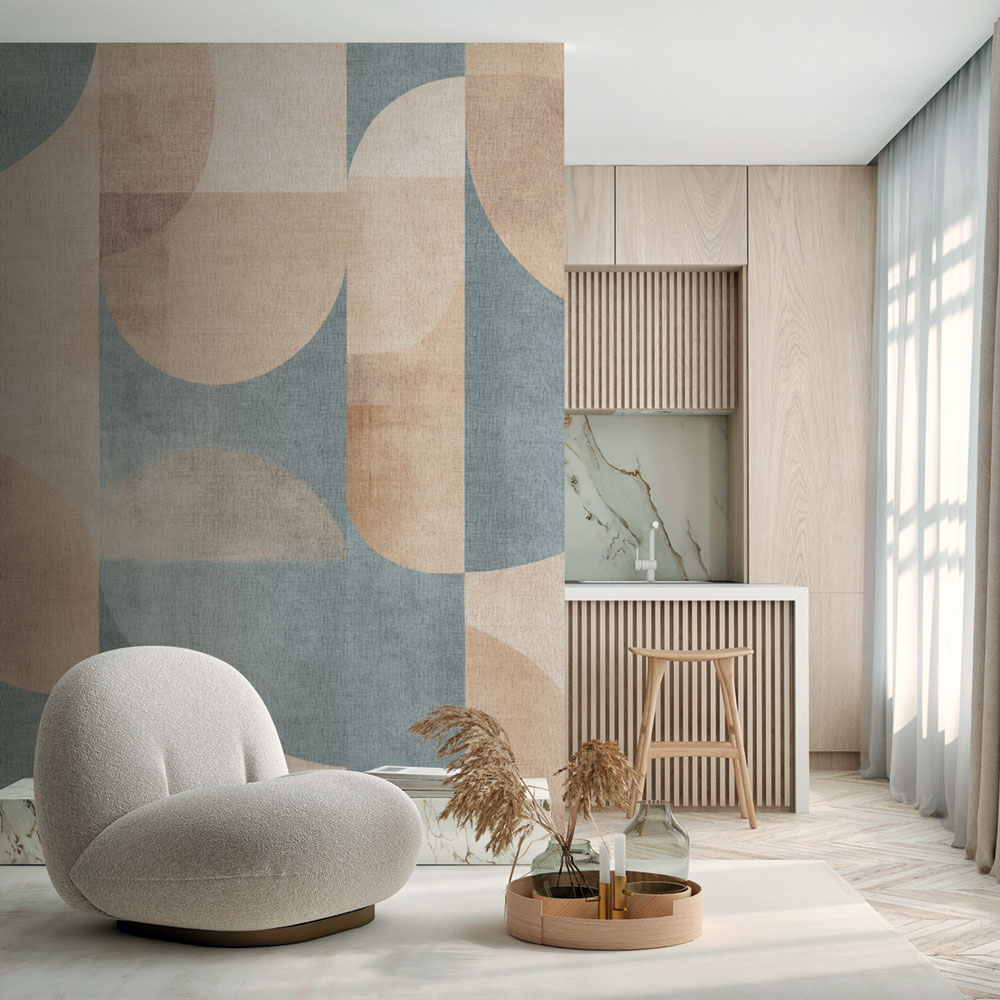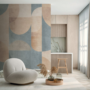 Luxusní vliesová obrazová tapeta na zeď s vinilovým povrchem a jemnou textilní strukturou, obrazce, v odstínech modré, béžové, hnědé a šedé.