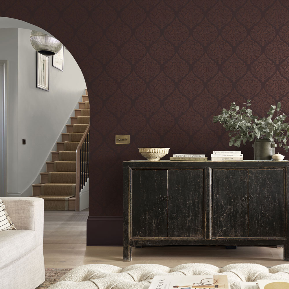Vliesová tapeta na zeď, matný tmavě vínový podklad, pololesklý ornamentální vzor s rostlinami a ptáčky.