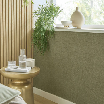 Vliesová tapeta na zeď, zelená melanž, imitace hrubší tkaniny.