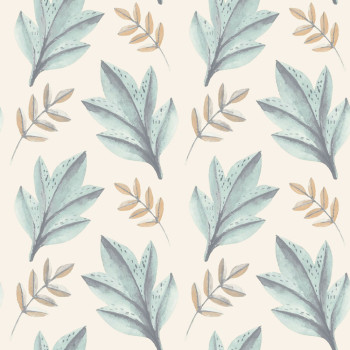 Hladká vliesová tapeta na zeď, bílý podklad, větší modré listy délka 20 cm, menší šedo-zlaté listy o délce 15 cm.