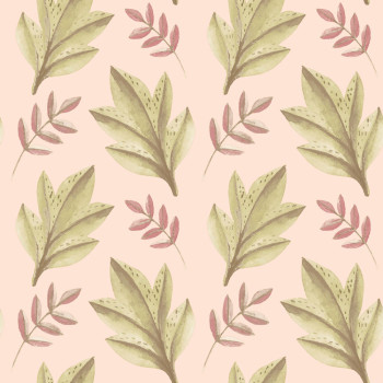 Hladká vliesová tapeta na zeď, růžový podklad, větší hnědo-zelené listy délka 20 cm, menší růžovo-hnědé listy o délce 15 cm.