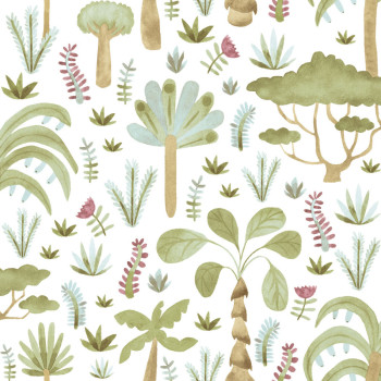 Dětská vliesová tapeta na zeď, tropické rostliny, bílý podklad, rostliny v zelené, modré, hnědé a fialové barvě.