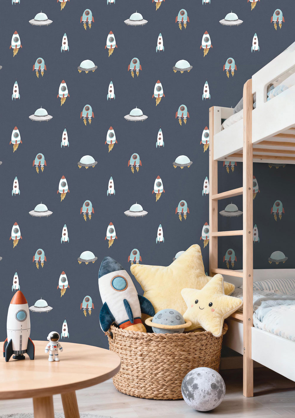 Hravá dětská vliesová tapeta na zeď, vesmírné lodě, tmavě modrý podklad, lodě v modré, červené, bílé, šedé a zlaté.