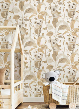 Roztomilá dětská vliesová tapeta na zeď, medvídci koala a rostliny v odstínech béžové, hnědé, šedé a zlaté na šedo-bílém podkladu.