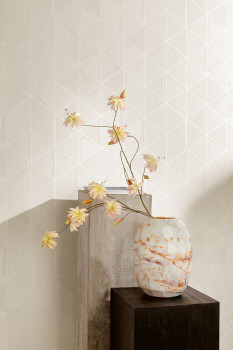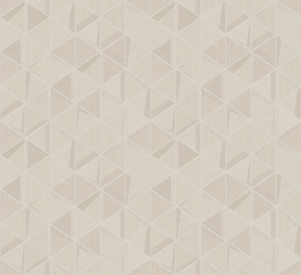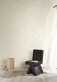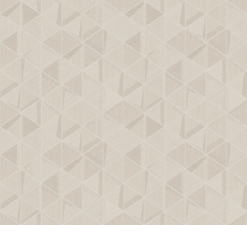 Luxusní vliesová tapeta na zeď, béžový podklad s krémovým plastickým šrafováním a stříbrnými metalickými konturami trojúhelníků .